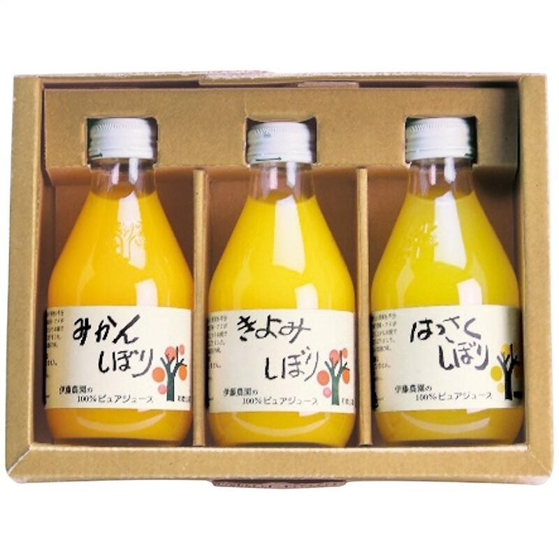 現品・内容・サイズ・材質: 100%ピュアジュース(みかん・きよみ・はっさく各1瓶・各180ml)