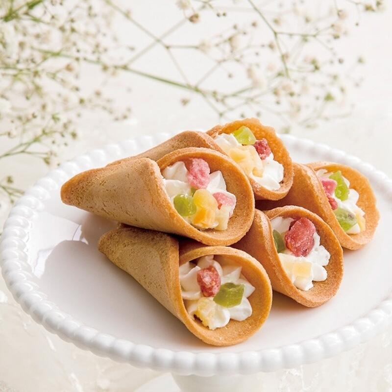 京都の伝統菓子「京せんべい」にクリームを絞り、職人が1個づつ丁寧に包み込み、花束の形に仕上げました。可愛らしい見た目のお菓子は皆様の心も華やかに彩ります。