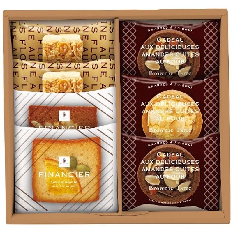 現品・内容・サイズ・材質: フィナンシェ(オレンジ・キャラメルアーモンド各1個)・タルト(ブラウニー2個・ホワイトブラウニー1個)・フロランタン2個