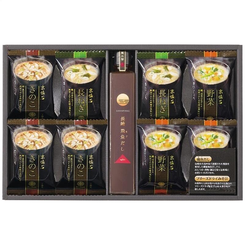 お湯を注ぐだけで本格的な味わいのフリーズドライ味噌汁と、使いやすい液体タイプの飛魚だしの詰合せです。