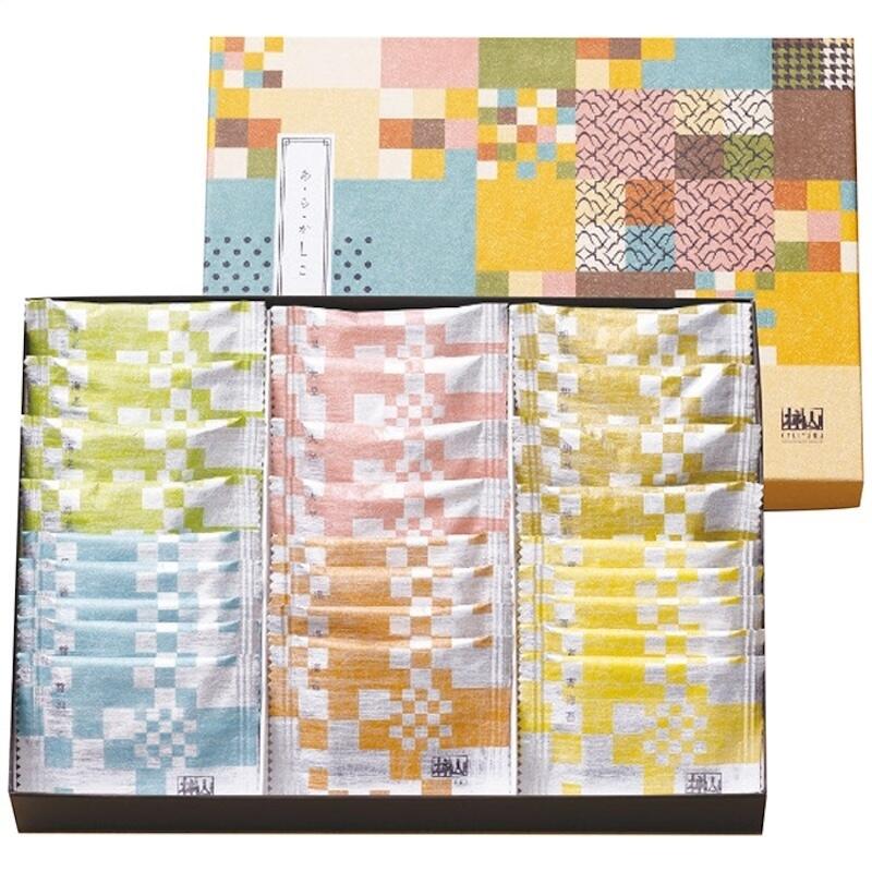 ひとくちサイズの6種のおかきをすべて個包装にして詰合せました。醤油・青海苔・胡麻・海老・大豆・海苔巻とバラエティに富んでいます。カラフルな化粧箱のデザインは、日本の伝統工芸「寄木細工」をイメージしています。