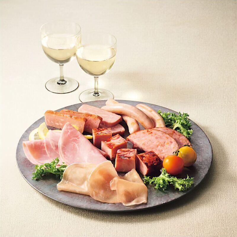 スモークローフ140g、焼豚120g、特級あらびきステーキ50g、生ハムロース32g、特選ももハム40g、あらびきウインナー60g
