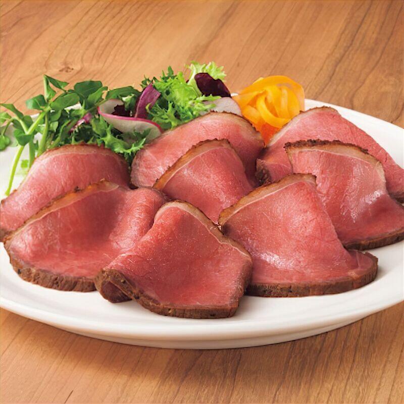 国産牛の旨みを引き立てるため「焙煎黒胡椒」、「焙煎オニオン」を使用し、真空調理製法でしっとりジューシーに仕上げました。添付のトリュフ入りグレイビーソースをかけてお召し上がりください。
