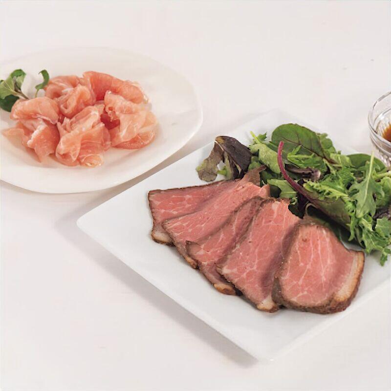 オードブルにピッタリな真空調理で仕上げたローストビーフと生ハムのセットです。