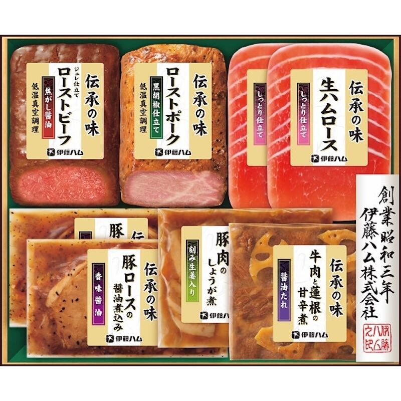 低温真空調理(ローストビーフ焦がし醤油ジュレ仕立て180g、ローストポーク黒胡椒仕立て160g)、豚肉のしょうが煮130g、牛肉と蓮根の甘辛煮120g、豚ロースの醤油煮込み香味醤油70g・生ハムロース45g×各2