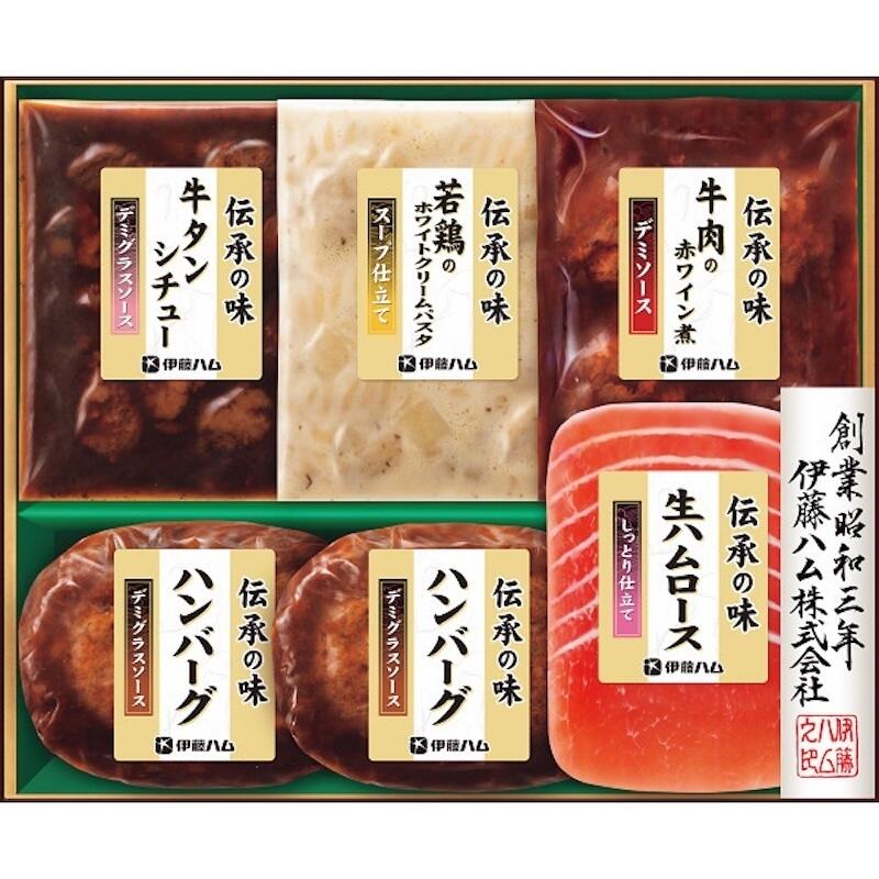牛肉の赤ワイン煮デミソース180g、牛タンシチュー デミグラスソース・若鶏のホワイトクリームパスタスープ仕立て各170g、生ハムロース45g、デミグラスソースハンバーグ(牛肉・豚肉使用)120g×2