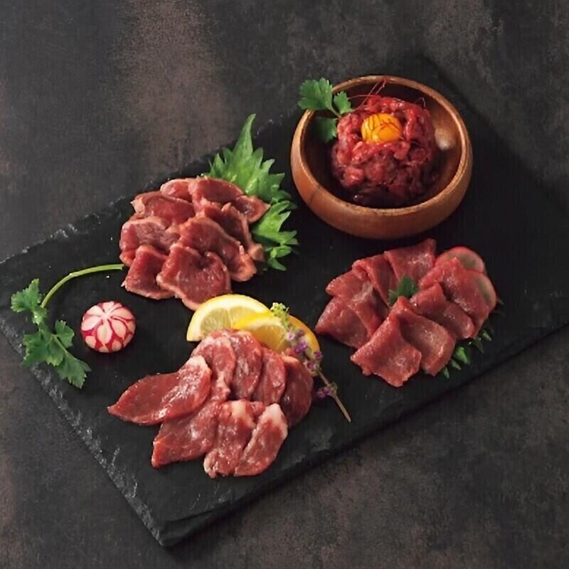 ふじ馬刺したたき・ロース・上赤身各80g、ふじ馬刺しユッケ50g×2(馬刺し:カナダ産又はフランス産又は国産(熊本肥育))、馬刺しのたれ5ml・生姜小袋3g×各4、ユッケのたれ10g×2、たたきのたれ20g
