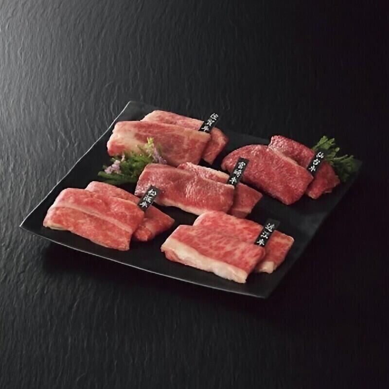 三重県産松阪牛バラ70g、滋賀県産近江牛バラ70g、宮城県産仙台牛バラ70g、宮崎県産宮崎牛バラ70g、佐賀県産佐賀牛バラ70g(計350g)、タレ60g×2