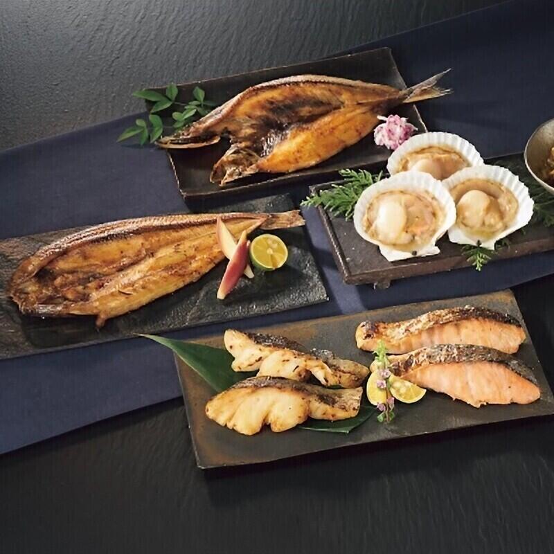 開きほっけ150g×1(ほっけ:北海道産)、開きにしん100g×1(にしん:北海道産)、ホタテ片貝3枚(ホタテ:北海道産)、塩秋鮭70g×2切(鮭:北海道産)、真鱈西京漬け70g×2切(鱈:北海道産)、数の子松前漬け80g(にしんの卵:カナダ産(大西洋))