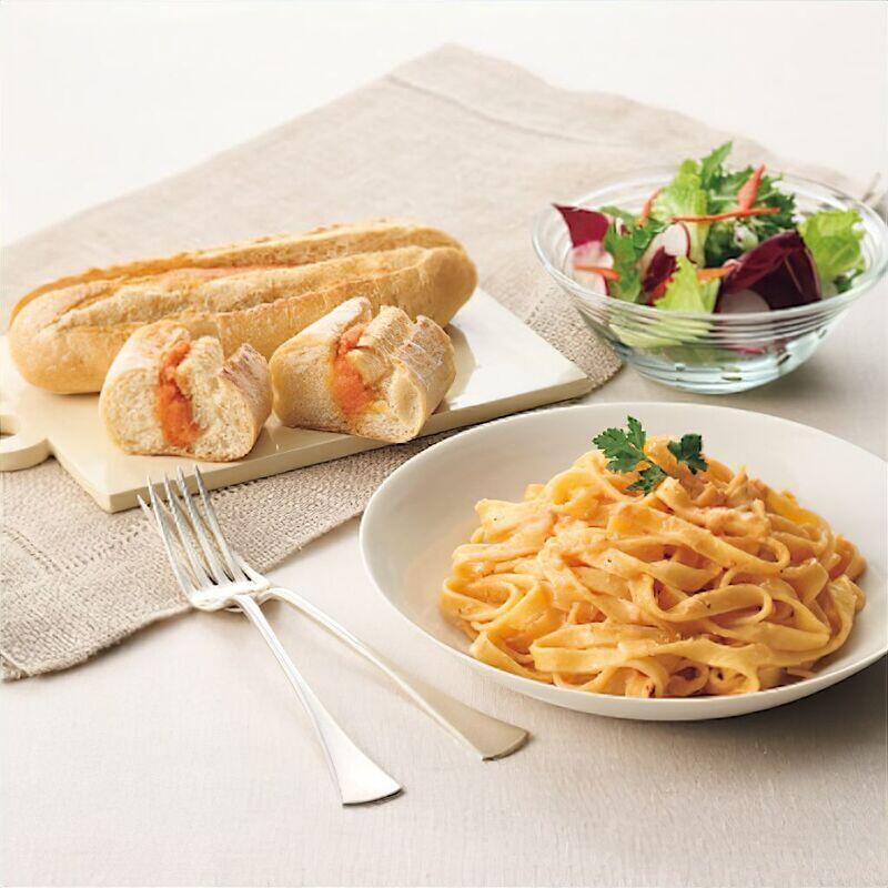 【パスタ】アサリの旨みと明太子の旨みに、食欲そそるガーリックをきかせた、ピリッと辛いめんたいアヒージョ風パスタと、クリーミーながらあっさりとした、明太子の旨みと辛みが引き立つ明太クリームパスタをセットにしました。【明太フランス】おうちで焼くだけで、手軽に本格明太フランスをお楽しみいただけます。