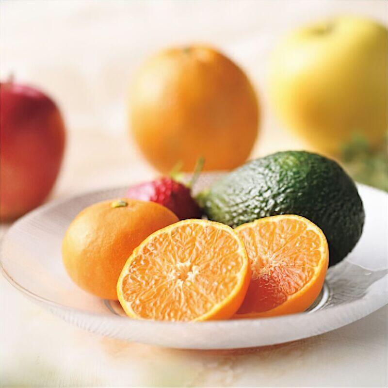 サンふじ(青森県産)×1、王林またはシナノゴールド(青森県産)×1、みかん(静岡県産)×2、いちご(静岡県産)×2、アボカド(メキシコ産)またはキウイ(ニュージーランド産)×1、オレンジ(アメリカ産)×1 ※フルーツの種類・品種・産地は変更となる場合があります。