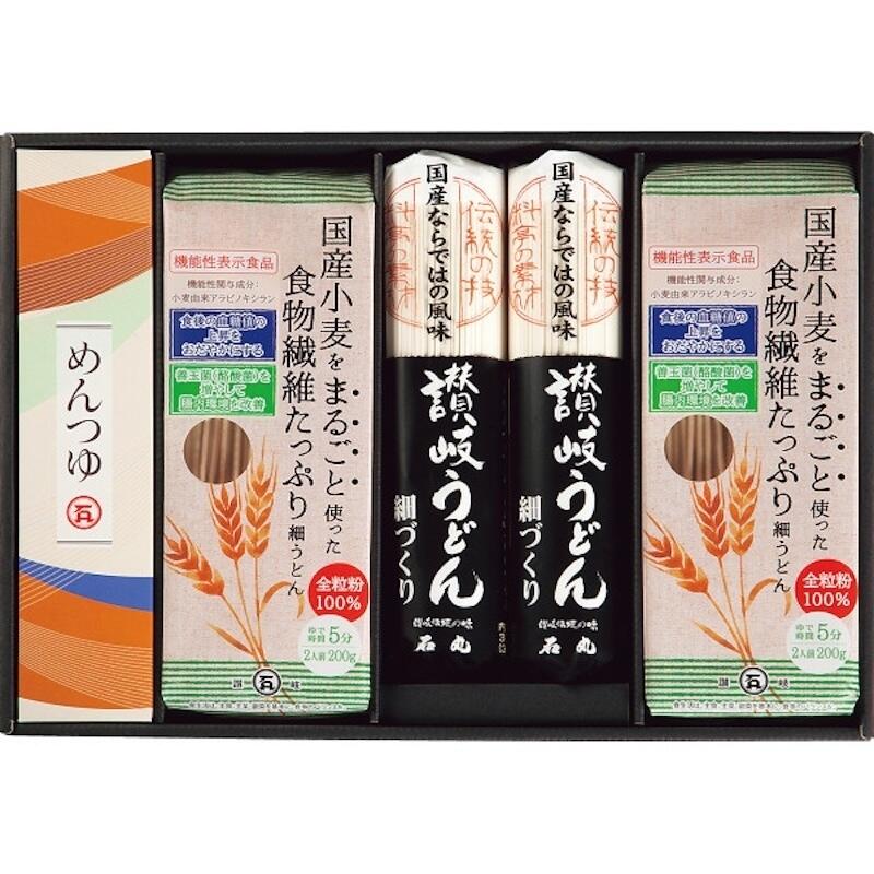 さぬきの夢うどん細づくり300g×2、全粒粉国産小麦まるごと細うどん200g×2、めんつゆ20ml×10