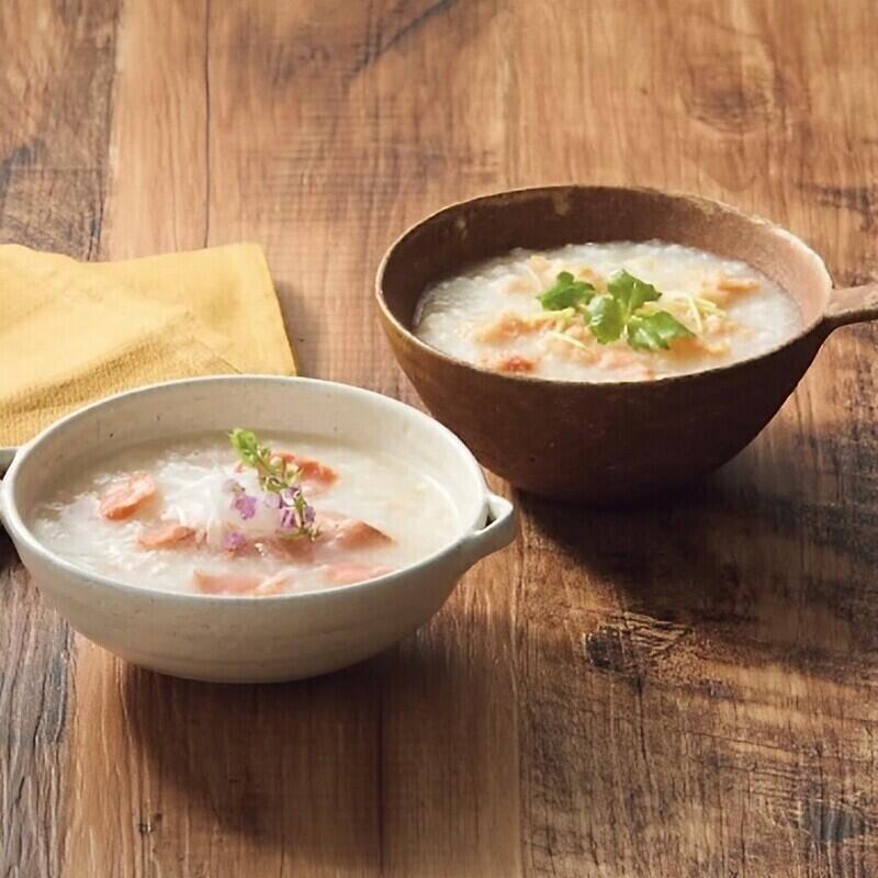 温めるだけで手軽に楽しめる、「かに雑炊」と「紅鮭雑炊」の詰合せです。