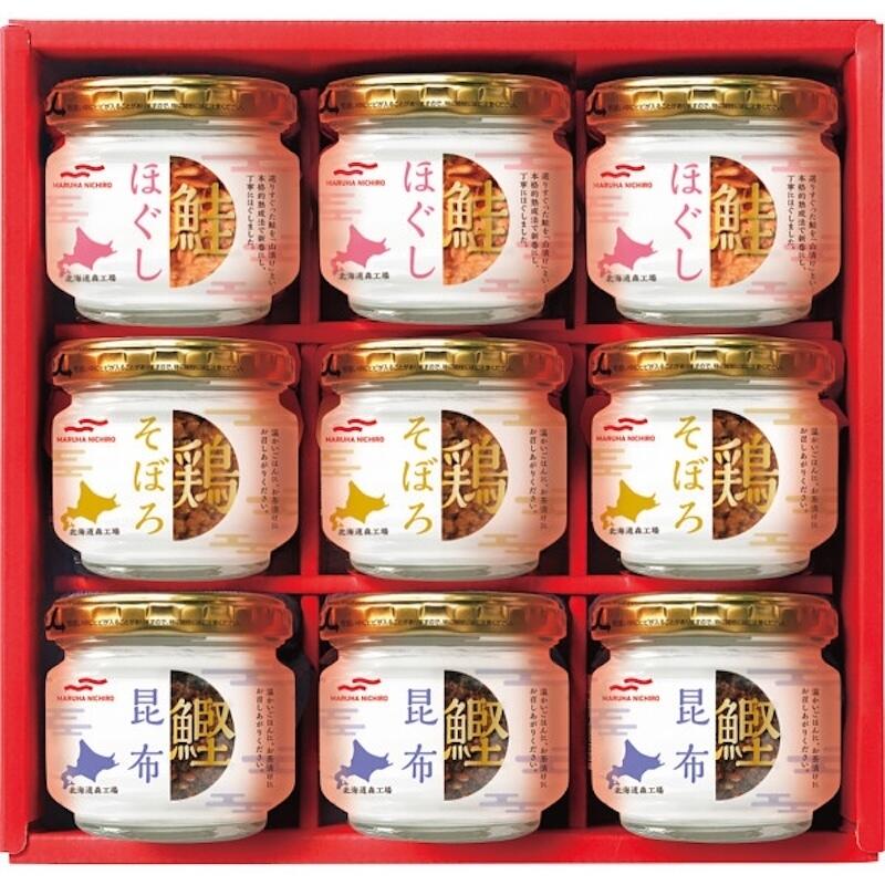 「さけ」、「鶏」、「鰹昆布」の3種類の瓶詰を詰め合わせた瓶詰のバラエティセットです。