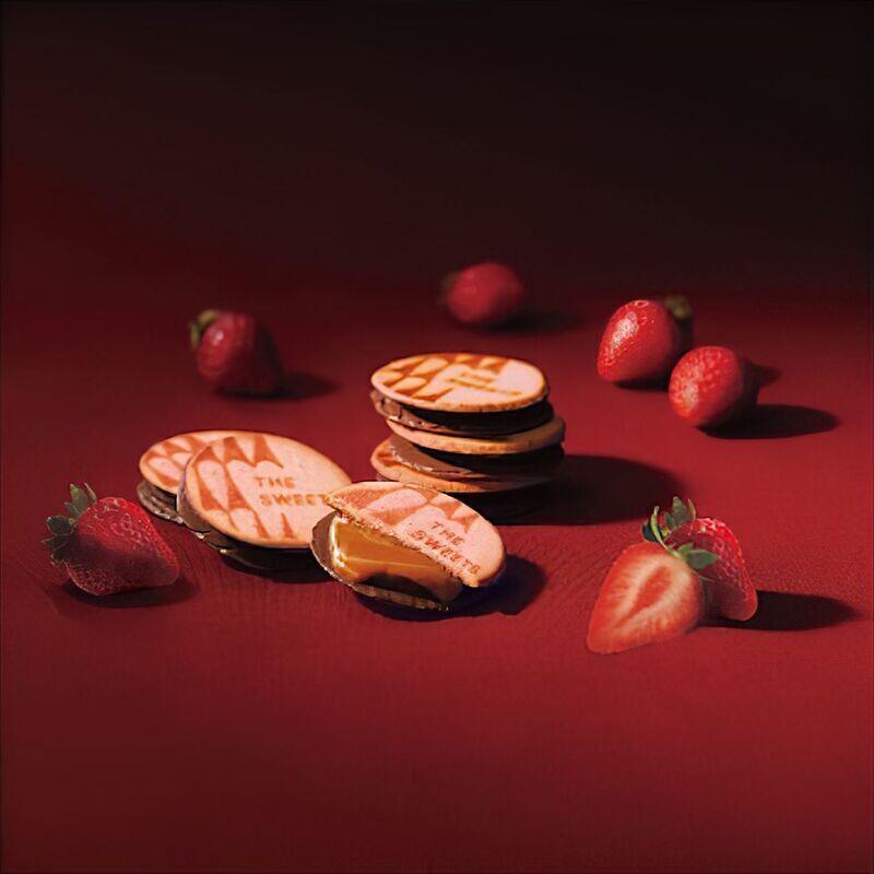 あまおう苺のフリーズドライを混ぜた濃厚なラングドシャ生地でキャラメルとチョコレートをサンドしました。