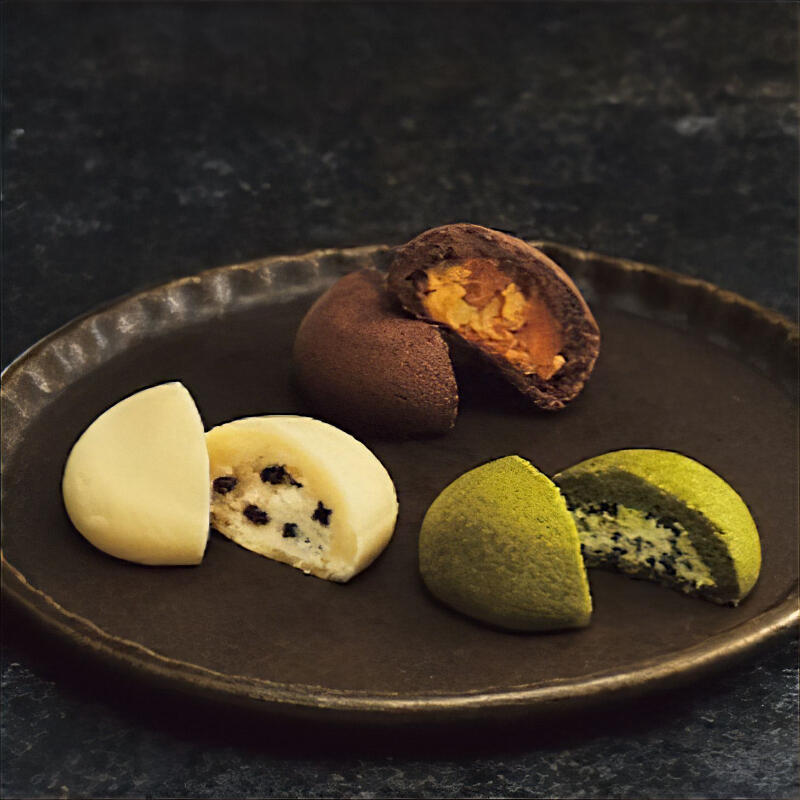 食感が楽しい素材がたっぷりつまった、包あん型のクッキー。【チョコクッキー&キャラメルナッツ】チョコ生地になめらかなキャラメルとサクサクナッツが入ったクッキー。【プレーンクッキー&ラムレーズン】プレーン生地にラムレーズンが入ったクッキー。【宇治抹茶クッキー&ココアビスケット】宇治抹茶の生地にザクザク感が楽しいココアビスケットが入ったクッキー。