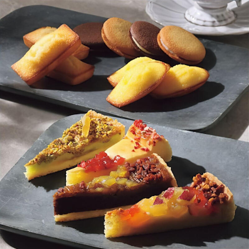 季節のおいしさをぎゅっと詰め込んだ季節限定タルト4種に、ブランド自慢のフィナンシェやマドレーヌ、ラング・ド・シャを組み合わせた贅沢な詰め合わせ。色とりどりの見た目はまるで小さなケーキのように華やかで、日持ちも安心。