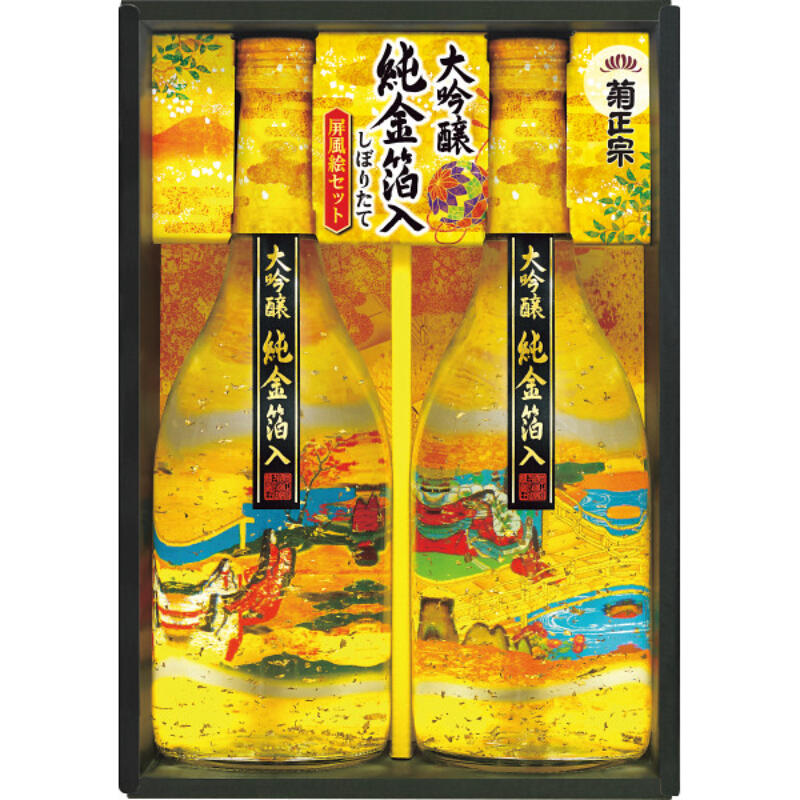 雅やかな屏風絵が鮮やかに浮かび上がる新年にぴったりの華やかな雰囲気のセット。純金箔入しぼりたて大吟醸生貯蔵酒2本入