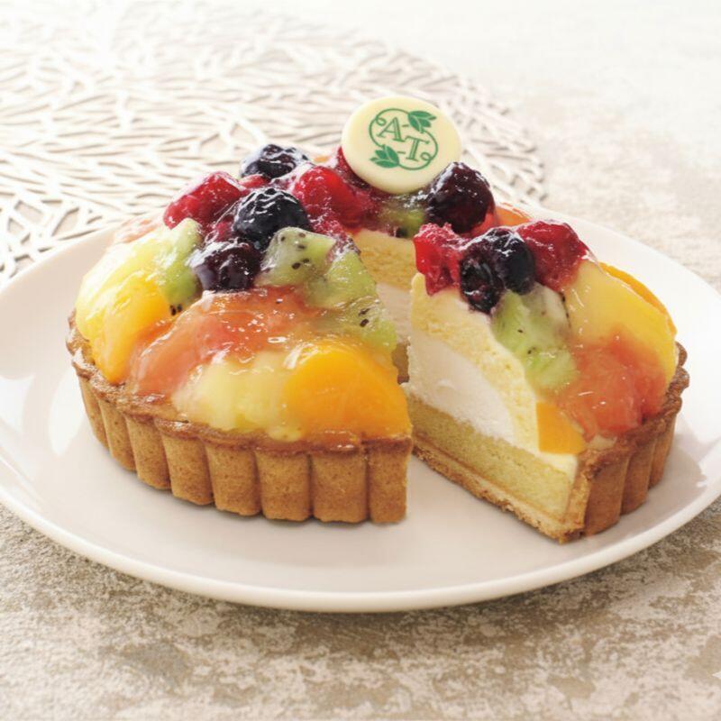 いろとりどりのフルーツを使った華やかなタルトケーキ。アーモンド生地のタルトに2種類のクリームとスポンジを重ね7種類のフルーツを飾り付けました。