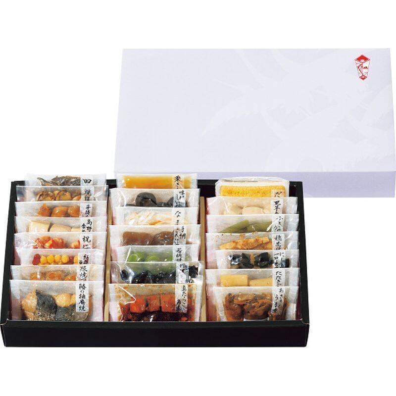 田作り20g、丹波黒黒豆60g、ふきのうま煮50g、里芋含め煮4個、たたきごぼう70g、にしん一口巻昆布6本、栗きんとん70g、味付しいたけ5枚、穂先竹の子3切、なます50g、真たらこ角煮70g、鰆の柚庵焼2切、焼ほたて3個、子持ちいかのうま煮3個、だし巻150g、手綱こんにゃく4切、高野豆腐含め煮6切、祝海老3尾、あさりのうま煮60g、若桃甘露煮5個、紅白豆マリネ65g、照焼つくね60g