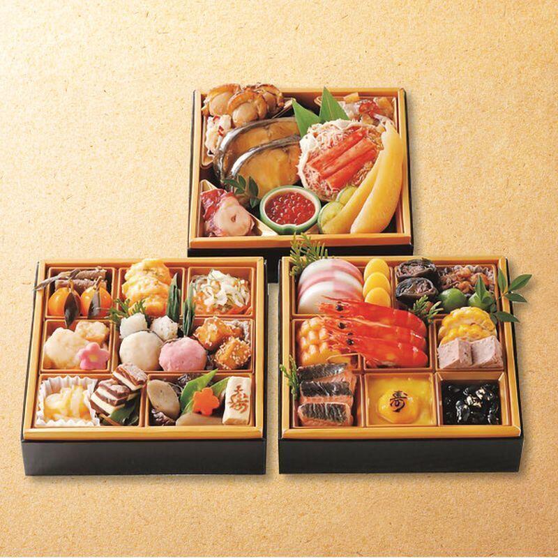 ★<壱の重>12品目:紅白蒲鉾、子持ちやりいか、にしん昆布巻、生炊きしらすくるみ、若桃甘露煮、伊達巻、ボイルえび、とうもろこしのテリーヌ、豚肉の田舎風テリーヌ、桜ます柚庵焼き、栗きんとん、黒豆<弐の重>8品目:ほたて昆布醤油、つぶの塩辛、ふぐ松前漬、銀だら煮付け、おおずわいがに甲羅盛り、いくら醤油漬、たこやわらか煮、味付数の子<三の重>15品目:たたきごぼう、葉つき金柑、えびマヨ、紅白なます、あんこうの甘酢漬、梅麩、松かさいか、紅白椎茸しんじょ、牛しぐれ笹包み、さつまいもの胡麻和え、さしみいか黄金、柿博多、中華わかめ、旨煮、寿湯葉★