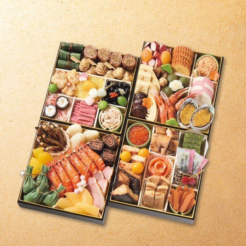 ★<一の重>9品目:網笠柚子甘露煮、小鮎甘露煮、松笠いか白焼、鮭昆布なると巻、お祝い海老、笹団子、数の子醤油漬、合鴨ロース、紅白松葉串<二の重>12品目:いくら醤油漬、鶏山椒焼、宇治抹茶羊羹、赤魚西京焼、鰤西京焼、スモークサーモントラウト、さごしのおぼろ包み、田作り、豚角煮、からすみ、金柑甘露煮、梅羊羹松葉串<三の重>15品目:湯葉にしん笹奉書、牛肉八幡巻、湯葉団子串、あんこうの南蛮漬、栗きんとん、梅餅、黒豆、紅鶴羊羹、白鶴羊羹、金時人参入り生酢、龍皮巻、梅酢蓮根の芽、ふぐの梅酢和え、若桃甘露煮、三色団子松葉串<四の重>16品目:たこの甘酢漬、あんず梅酢漬、伊達巻、帆立ひもの柚子和え、寿高野含め煮、味付こんにゃく、筍煮〆、椎茸旨煮、梅甘露煮、花百合根、紅白蒲鉾、蟹爪柚庵焼、あわび姿煮、梅型人参、手まり麩、松麩★