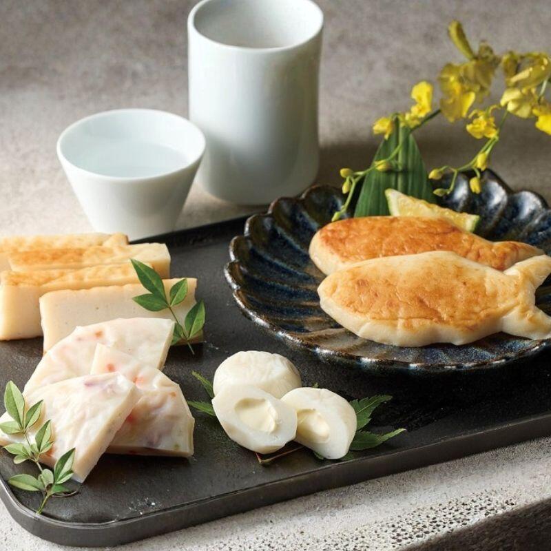 かまぼこの身に「金目鯛」を混ぜた焼かまぼこ、ソフトでなめらかなかまぼこ生地にチーズを包みこんだかまぼこ、かまぼこの身にはもを練り込み香ばしく仕上げた錦焼、たっぷりといかと野菜を練りこんだソフトな食感のかまぼこの詰合せです。