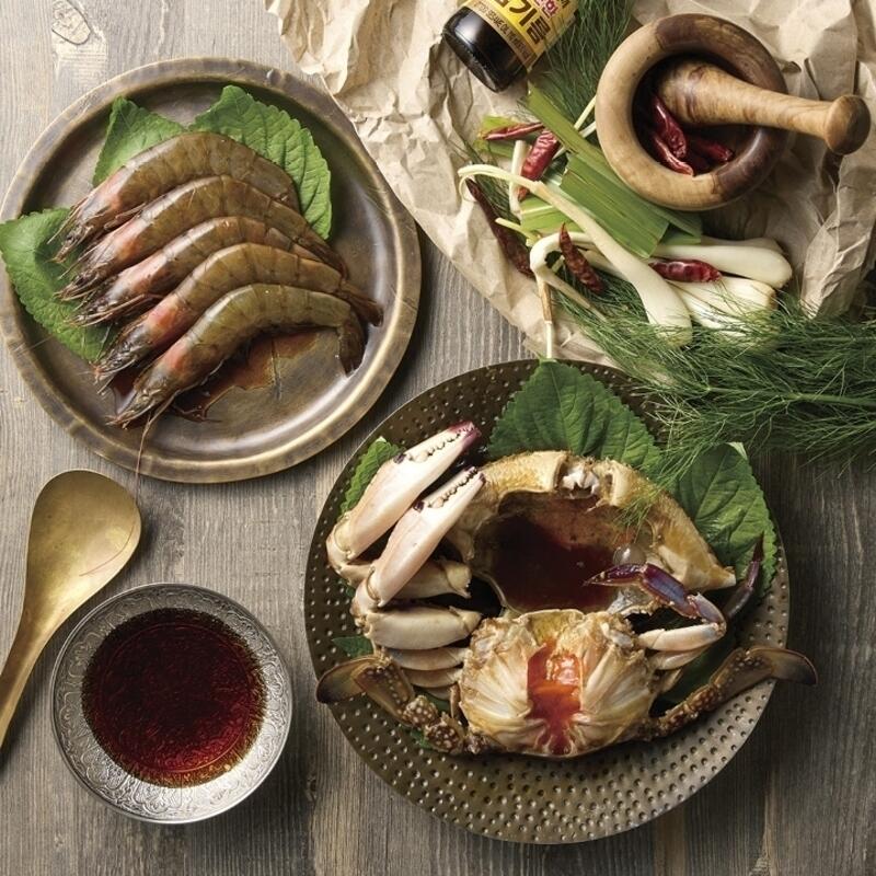 大阪・鶴橋の人気韓国料理店「百年の礎」より、特製カンジャンケジャンとカンジャンセウを贅沢に味わえるセットです。