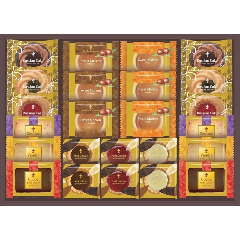 【セット内容】スイートマロン(メープル・キャラメル)×各3、サンドクッキー(ココア・バニラ・セサミ)・ロシアケーキ(リッチビター・マカロンストロベリー・フラワーキウイ)・プチガトー(ストロベリー・ミルクチョコ・ホワイトチョコ)×各2