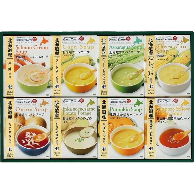 北海道素材の美味しさを、ぎゅっと詰め込んだスープコレクションです。。8種類のスープの詰合せです。(合計32食入り)