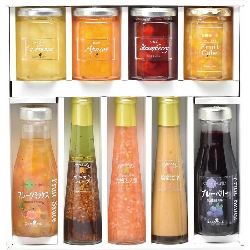 【セット内容】フルーツソース(ブルーベリー)(220g)・フルーツソース(フルーツミックス)(215g)・ミックスジャム(フルーツキューブ)(155g)・ジャム(いちご・ラフランス・あんず)(各145g)・ドレッシング(オニオンハーブ・ノンオイル大根と人参・焙煎ごま)(各122ml)×各1
