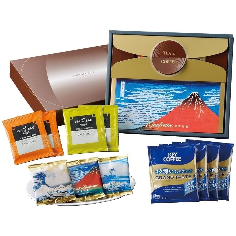 【セット内容】北斎ゴーフレット(バニラ・チョコレート・抹茶)・ドリップコーヒー(6g)・紅茶ティーバッグ(2.5g)×各4