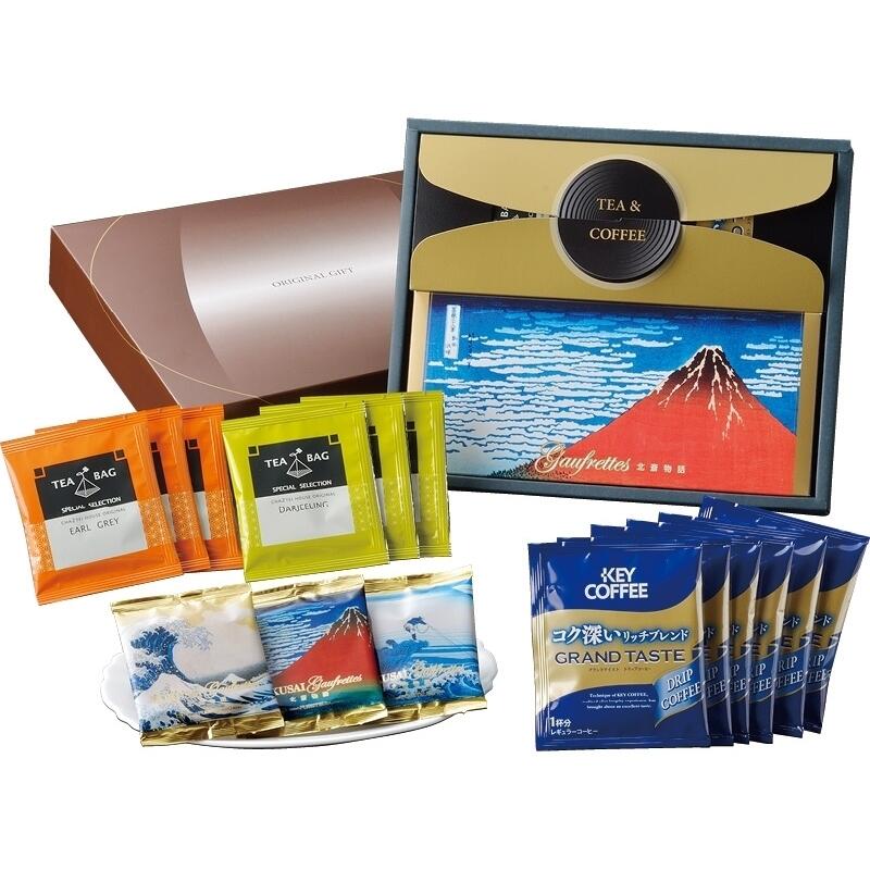 【セット内容】ドリップコーヒー(6g)・紅茶ティーバッグ(2.5g)×各6、北斎ゴーフレット(バニラ・チョコレート・抹茶)×各4