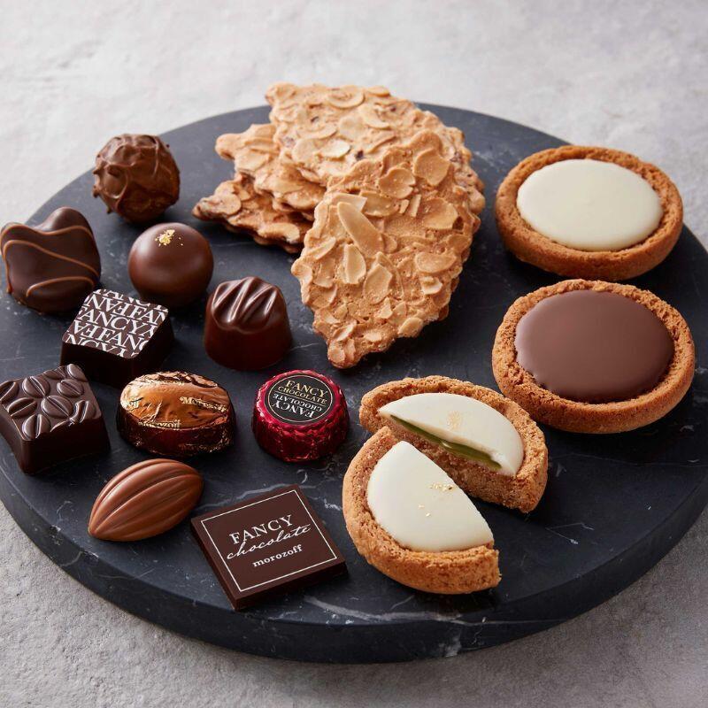 多彩な味わいのチョコレートの詰合せ、ナッツをしきつめて香ばしく焼き上げたファヤージュ、さっくりとした食感のクッキーにチョコレートをバランスよくサンドしたオデット、リッチなおいしさを楽しめるとろけるソース入りサブレオショコラ。