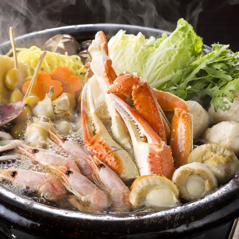 「ずわいがに」をはじめ「海老」や「帆立」などの魚介を詰め合わせ、各素材の旨味が活きる塩仕立ての鍋に仕上げました。シメは残りたれに「ラーメン」を入れてお楽しみください。ご自宅の野菜も一緒に煮込んでからお召し上がりください。