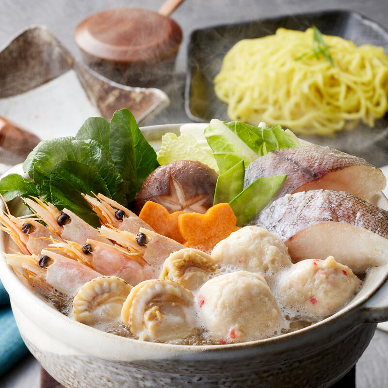 北海道産の助宗鱈や、帆立の他にも海老、つみれなどを旨味ある塩仕立てのたれでいただく海鮮ちゃんこ鍋の具材を1~2人前の少量タイプにセットしました。お好みで野菜などを足していただくだけで本格的な鍋をお楽しみいただけます。〆はラーメンでどうぞ!!
