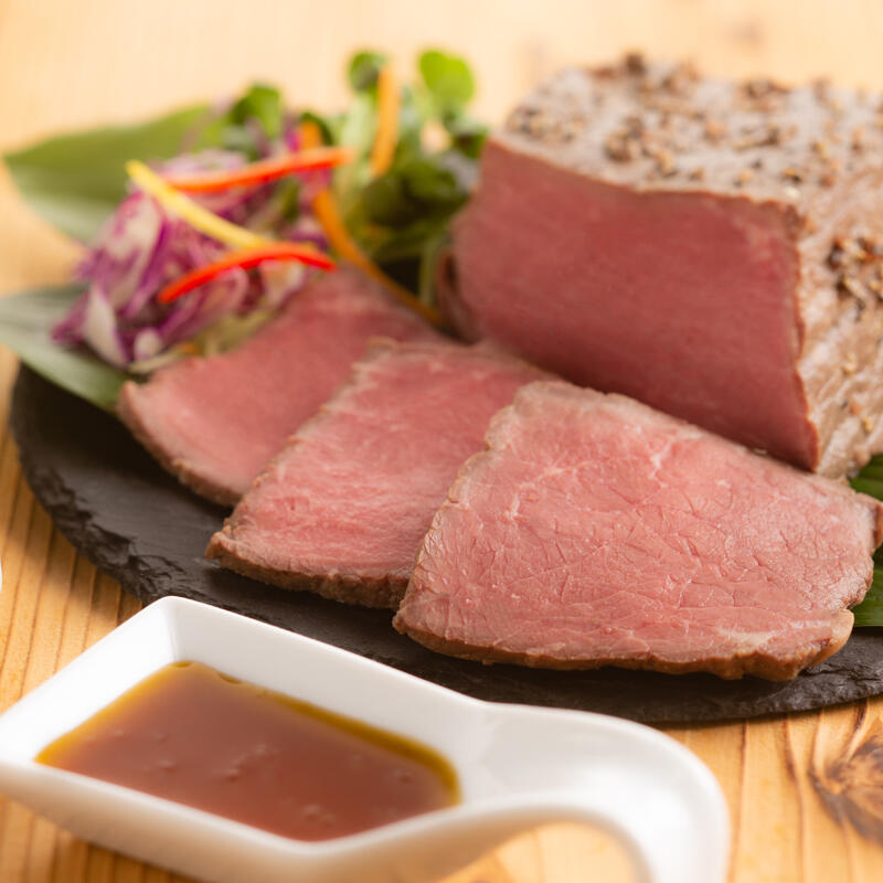 東京四谷にある和食の名店鈴なりの村田明彦シェフが監修したローストビーフです。数種類のスパイスをブレンドし、下味を丁寧に手作業でつけて真空加熱でじっくり焼き上げ、中はしっとりと仕上げました。シェフこだわりの柚子胡椒のソースは清涼感がありながらもピリッとアクセントが効いた和風ソースです。肉本来の旨みを堪能できる和風のローストビーフです。