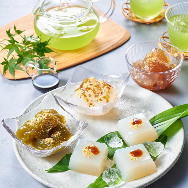 【商品内容】わらび餅(プレーン、黒糖、抹茶)100g×各2、くずもち50g×5、黒糖蜜11g×6、きな粉3g×9