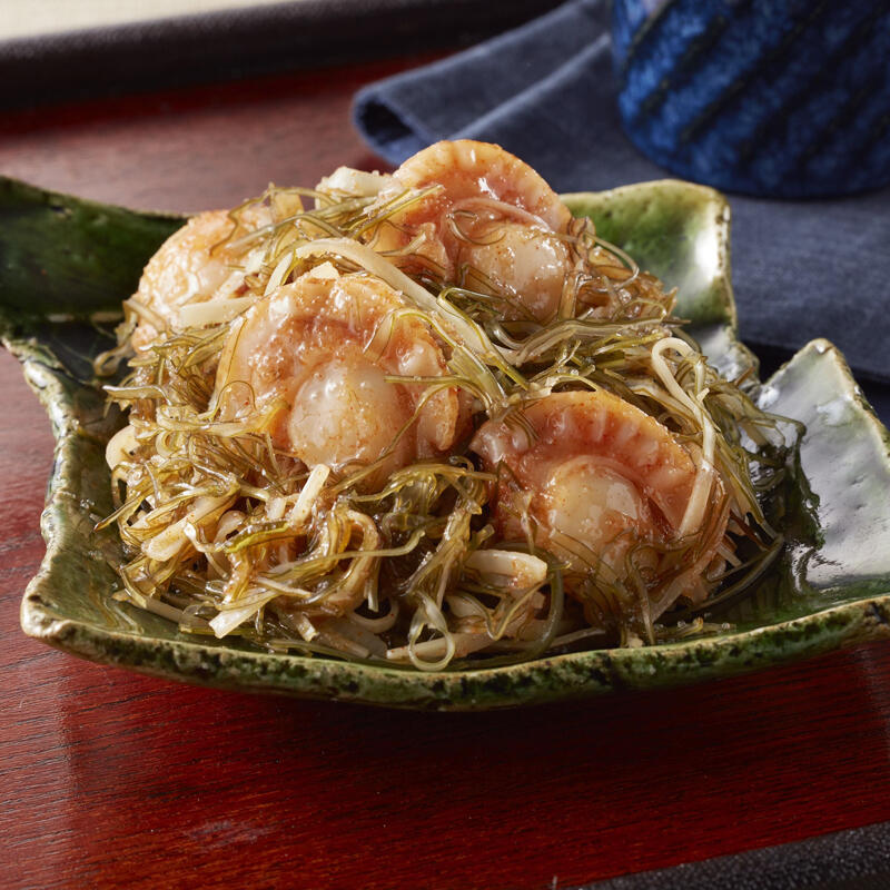 辛子明太子のつぶつぶを加えたタレに、昆布やいか、ほたてをじっくりと漬込んだ明太松前です。