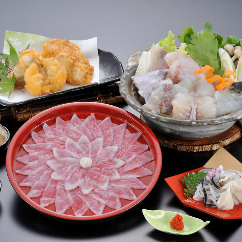 国産のふくを使用した少人数用のフルコースです。熟練の職人が造る「とらふく刺身」 「とらふく皮」 「ふくちり」 「ふくから揚げ」 「ひれ酒」のもたらしてくれる奥深く豊かな味わいを、贈り物にまたはご家庭用として、お楽しみください。