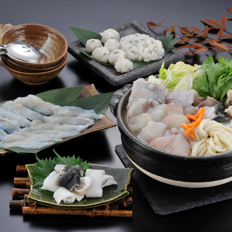 鍋の王様「ふくちり」に、珍しい「ふくしゃぶしゃぶ」が2種、旨味たっぷり「ふくつみれ」、とらふくの皮が入った「ふくうどん」と5種類の味を「ひれ酒」と一緒に楽しめるオリジナルメニューです。もちろん最後のシメには「ふく雑炊」をお楽しみください。