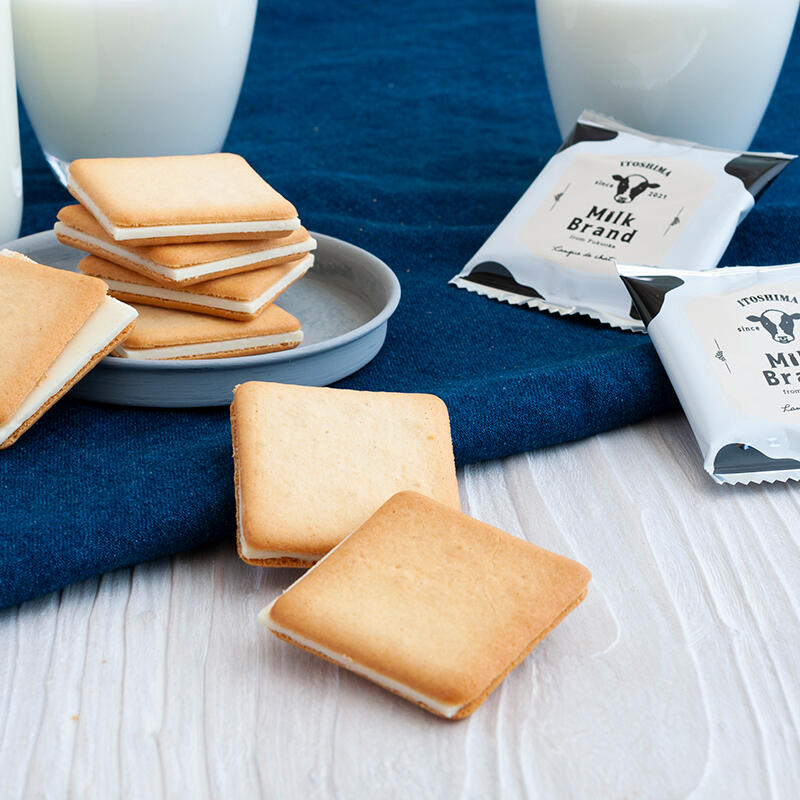 福岡・糸島の牛乳「伊都物語」をクッキーに練り込み、ホワイトチョコをサンドしました。さくっとミルクの風味香るラングドシャです。