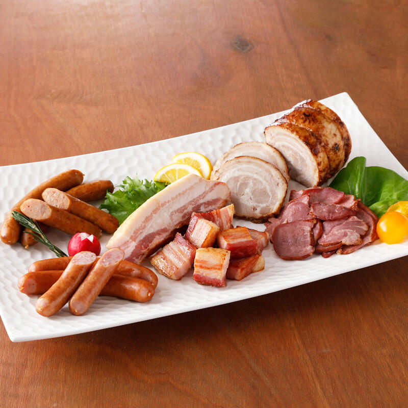 【商品内容】焼豚250g×1、ベーコン250g×1、荒びきポークウィンナー120g×1、ぴり辛ポークウィンナー120g×1、豚タンスモークスライス60g×1