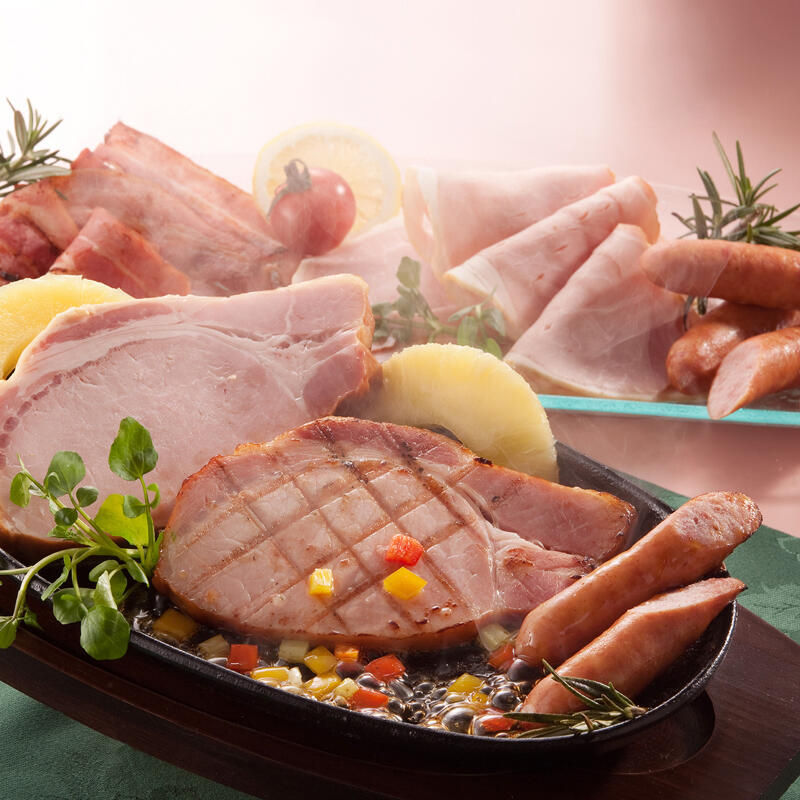 【商品内容】ロースハムステーキ150g、ロースハムスライス79g×2、ボンレスハムスライス80g、ベーコンスライス80g、あらびきウインナー130g、ブラートブルスト120g