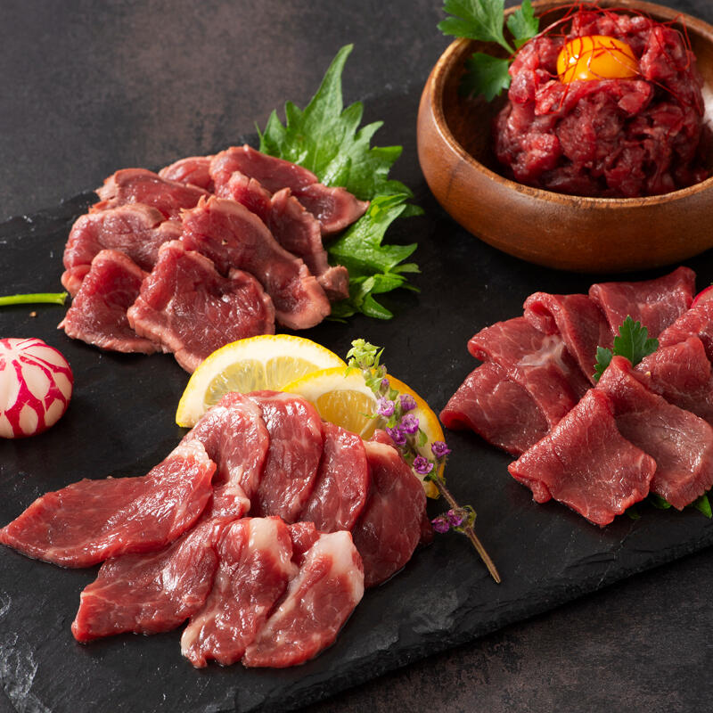 自社牧場育ちの安心安全な馬刺しを産地直送にてお届けいたします。 馬のロースは牛肉のロースとは違い、赤身肉になり、味わいは赤身の上級部位とされ非常に柔らかく、濃厚な旨みを堪能いただけます。たたきはあっさりとした味わいながらも、噛むほどに広がる馬肉の旨みを堪能頂けます。もっともポピュラーな赤身肉はモチっとした食感と歯切れの良さが特徴です。ユッケは独特の食感と馬肉本来が持つ旨みとサシの甘みが絶妙に引き立て合っています。馬刺しと黒毛和牛の専門店「フジチク」より産地直送にてお届けいたします。