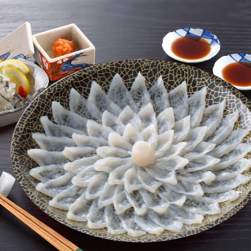 菊の花のように盛り付けられたとらふく刺身は、皿の上に咲く花のようで、まさに圧巻です。とらふくの上品な味わいと食感を特製ポン酢でお楽しみください。