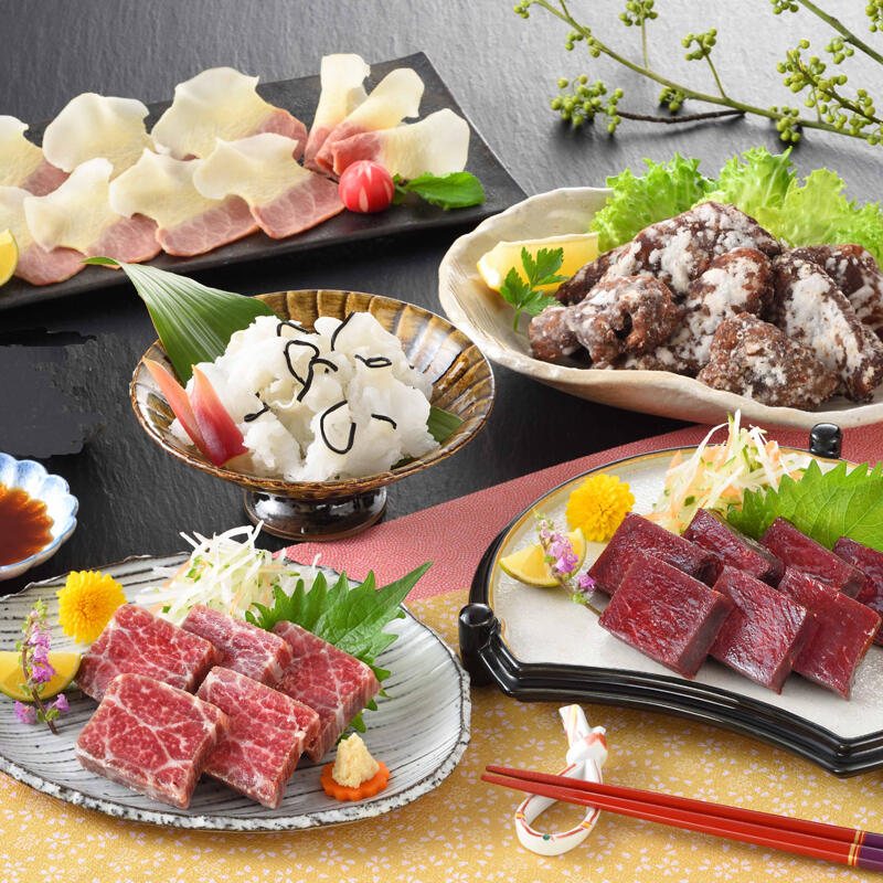 【商品内容】鯨竜田揚げ150g、鯨赤身肉(刺身用)100g、尾の身(尾肉)100g、鯨おばいけ100g、鯨ベーコンスライス50g