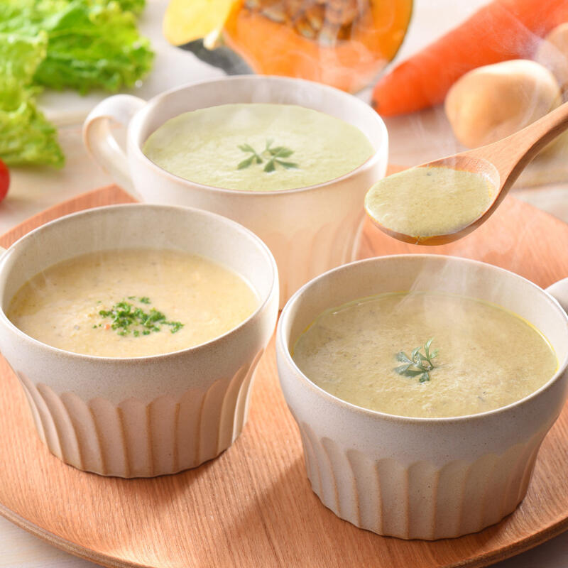 【商品内容】蓮根とほうれん草のグリーンポタージュ180g、たっぷり蓮根とゆずのポタージュ180g、とうもろこしの贅沢ポタージュ180g