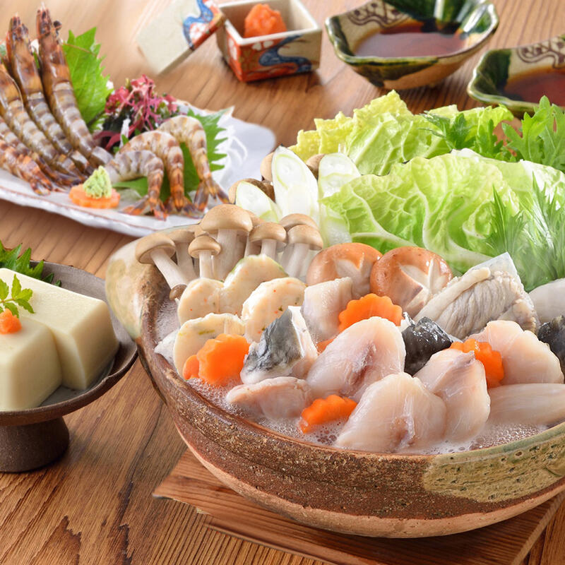 美味しさ溢れるふくちり鍋と、プリプリとした食感で甘味のある車海老の刺身セットです。とらふく白子を使用した風味豊かなふく白子豆腐とお好みの野菜を入れて、ふくのちり鍋をお楽しみください。車海老は鍋でしゃぶしゃぶにしても美味しくお召し上がりいただけます。