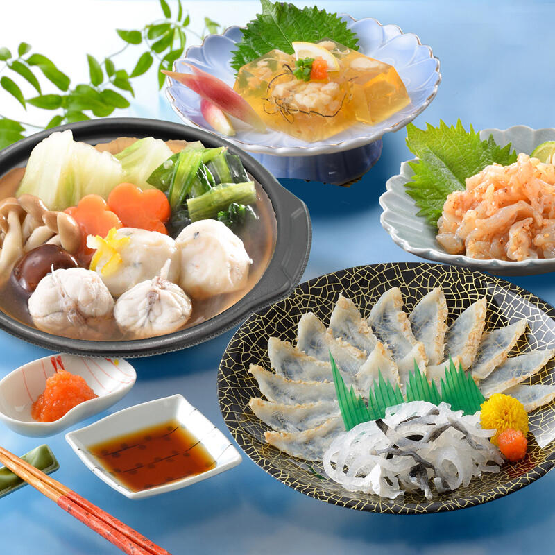 【商品内容】真ふぐ寄せ鍋(個食鍋)300g、真ふぐたたき刺身(17cm皿)20g、とらふぐ皮20g、とらふぐ塩辛60g、ふぐ煮こごり100g、ふくポン酢10g×2、もみじおろし10g×2